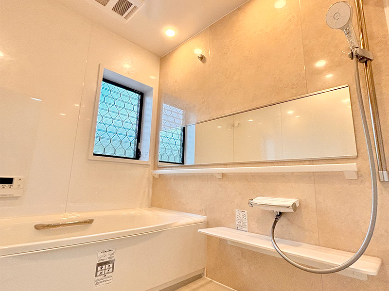 浴室は、長い鏡を設置しつつ、前の手すり兼棚部分は手すりのみ残す仕様にしたMタイプを選び、お客様の使い勝手に配慮しています。